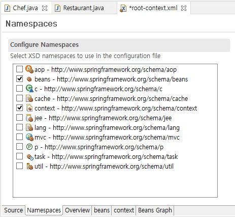 root-context.xml 파일을 누르고 Namespaces 탭에서 context 항목을 체크해준다. (beans는 이미 체크되어있을 것이다)