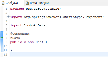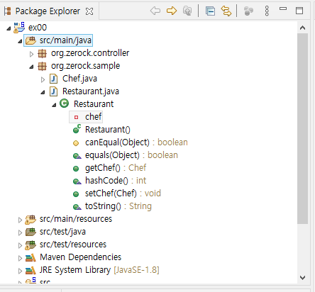 ex00 프로젝트에 패키지(org.zerock.sample)와 클래스(Restaurant, Chef) 생성한다.