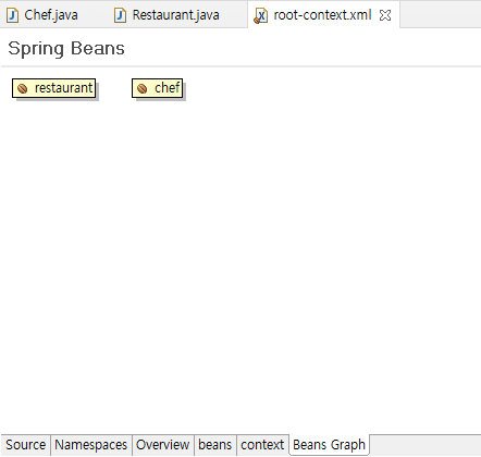 변경된 xml 저장하고 Bean Graph 탭을 선택해보면 Restaurant와 Chef 객체가 설정된 것을 확인할 수 있다.