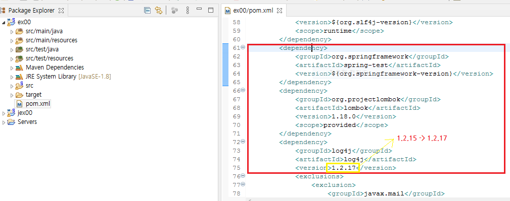 ex00 프로젝트의 pom.xml에 추가하거나 변경할 라이브러리들이 존재한다.