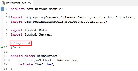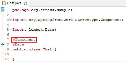 Chef 클래스에 @Component가 없다면 스프링은 Chef 객체를 스프링에서 관리하지 않게 됨. 따라서 실행 시 에러 발생