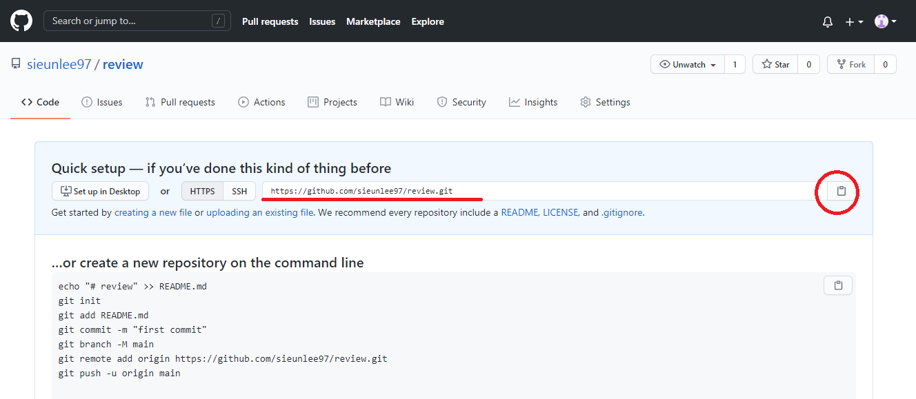 생성 후, 아래 페이지가 뜨면 표시된 부분을 눌러 URL을 복사한다. 그럼 이제 버전관리할 준비가 됐다.