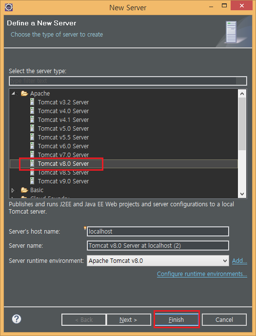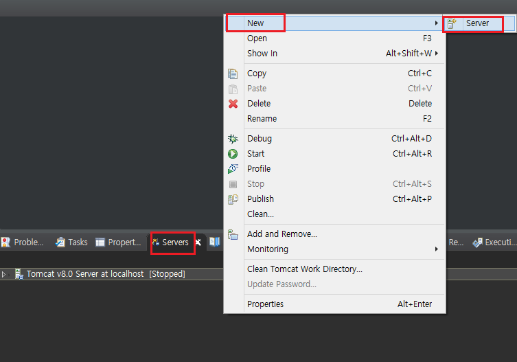 Server 탭에 들어가 우클릭 -> New - Server -> Tomcat v8.0 Server 선택