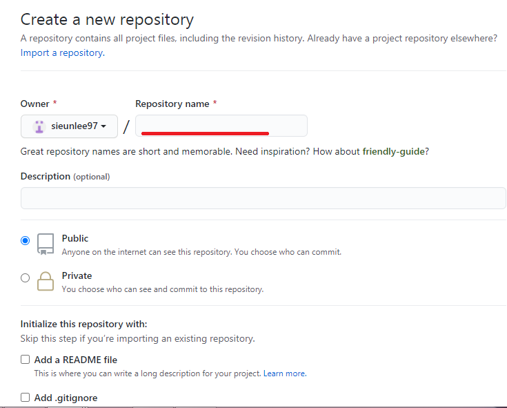 - Repository name을 입력 후, 나머지는 기본값으로 유지 후 생성한다.