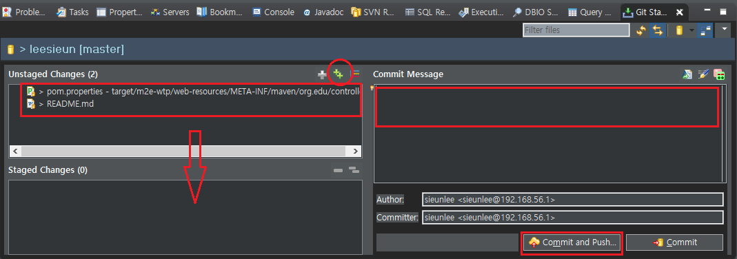 Commit and Push 버튼 누른다. 커밋만 하면, github.com에 저장 안 됨.
