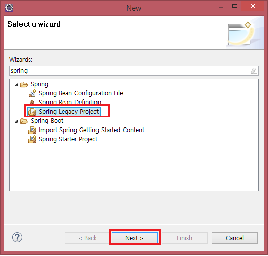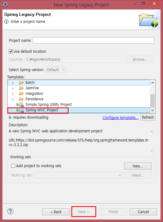 wizard는 Spring Legacy Project, Template는 Spring MVC Proejct를 선택한다.