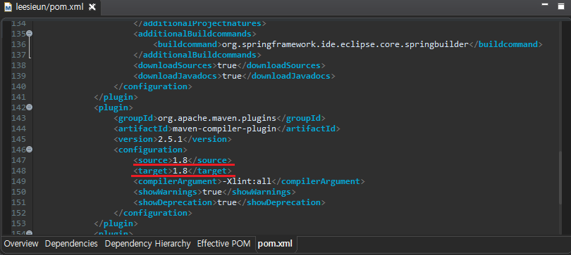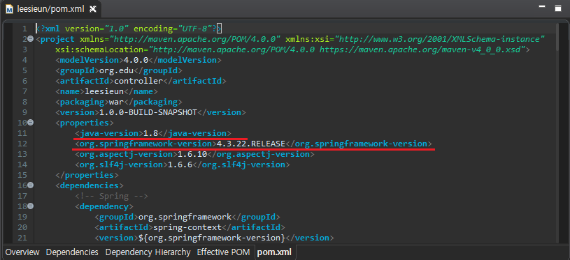 - pom.xml 파일에서 자바 버전(1.6 -> 1.8)과 스프링버전(3.1.1 -> 4.3.22)을 변경한다.