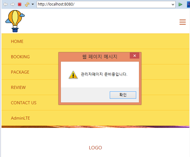 아직 페이지를 만들지 않았기 때문에, 링크 주소는 javascript:;로 적고 alert('관리자페이지입니다')를 넣어 실행여부를 확인한다.