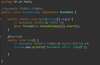 - Runnable 인터페이스에는 run() 메소드 하나만이 선언되어있다. 재정의(Override)해준다.