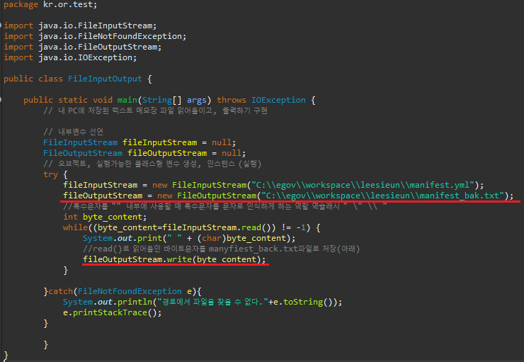 - 파일로부터의 출력(FileOutputStream)